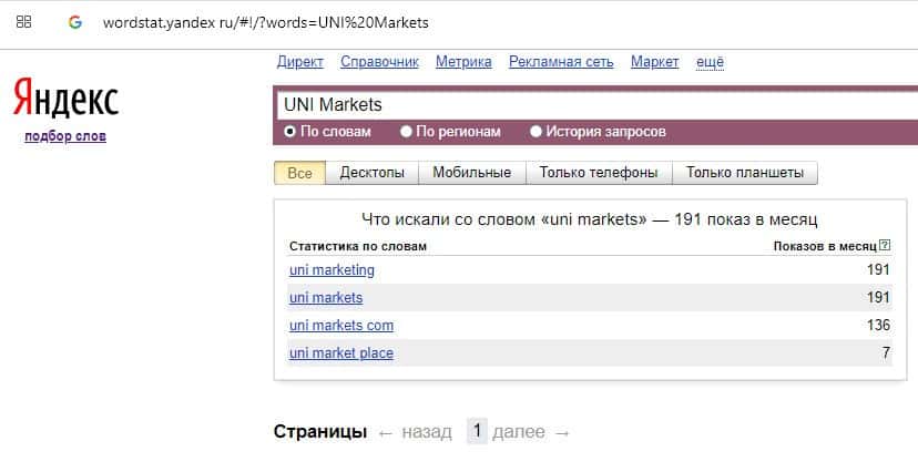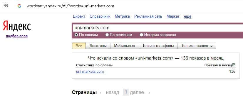 Количество запросов по бренду название домена компании "uni-markets.com" на Вордстарт Яндекс Ру составило 136 показов за месяц.