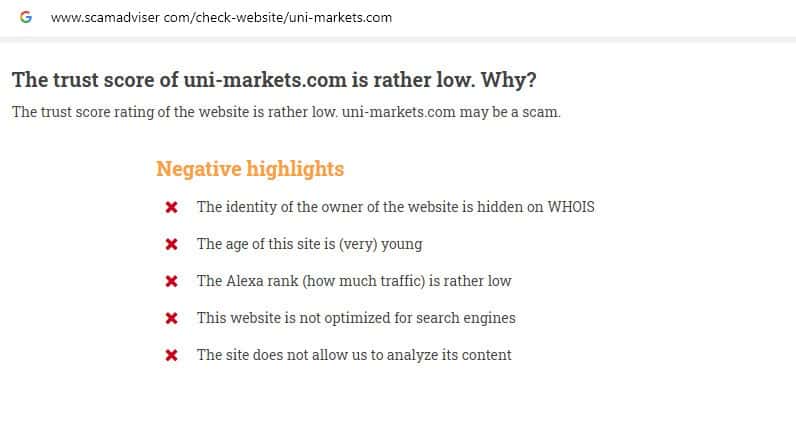 Проверка UNI Markets на веб-сайте скамадвайсер ком показала, что у данного сайта низкий рейтинг, а также выявлено множество отрицательных моментов в работе сервера.