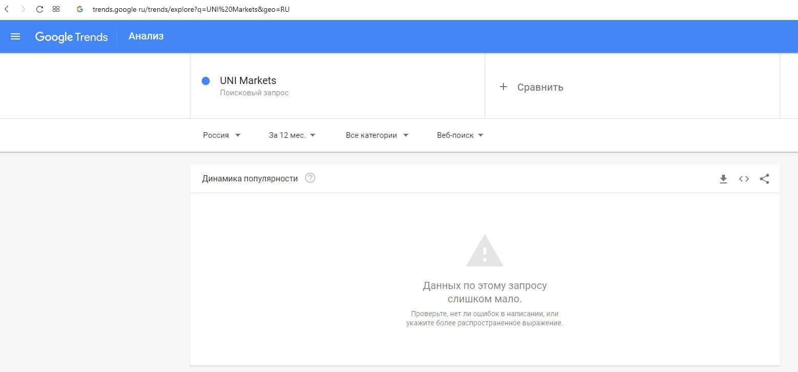 О количестве брендовых запросов англоязычного названия компании "UNI Markets" на Трендс Гугл Ру нет никакой информации.
