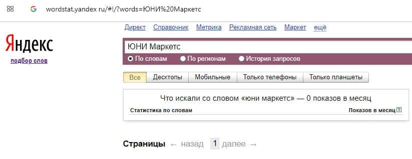 Количество брендовых запросов названия компании на русском языке "ЮНИ Маркетс" на wordstat yandex ru вероятно равно нулю.