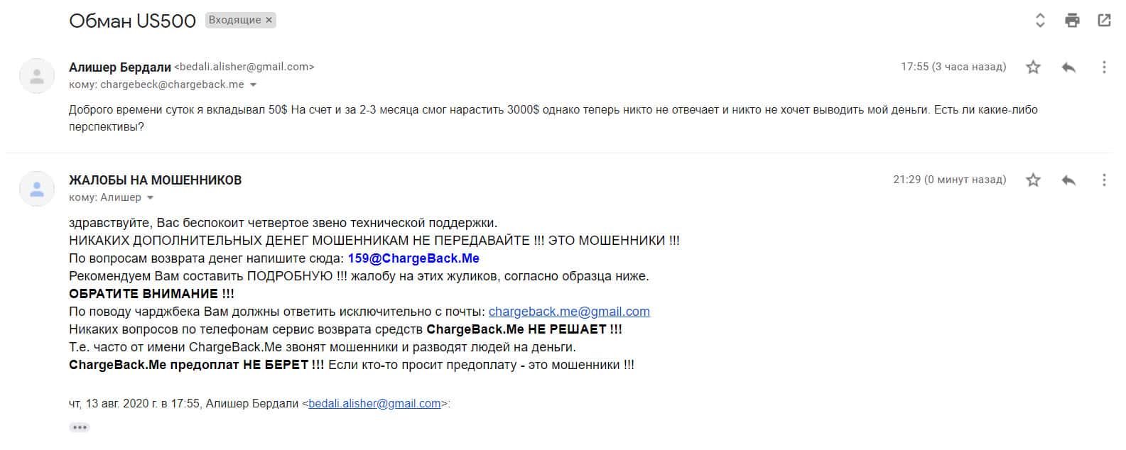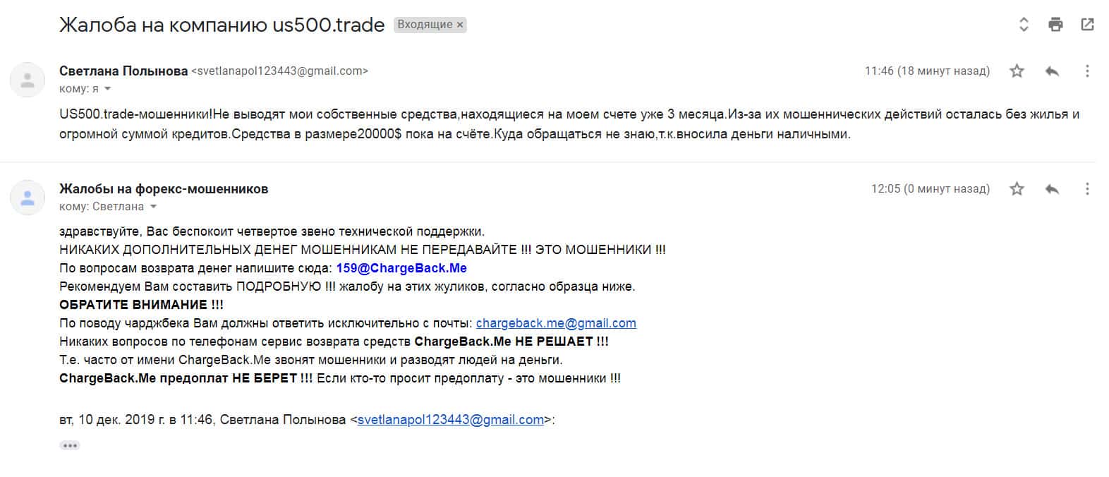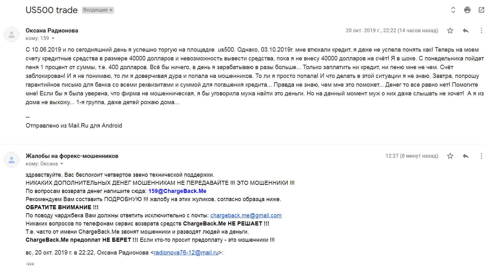 Очередная жалоба на жуликов US500 от обманутого клиента