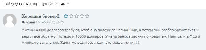 В следующем отзыве, один мужчина рассказал, как его жена стала жертвой мошенничества со стороны аферистов US500 Trade и теперь они требуют отдать им кредитные средства в размере 40 000 долларов. Его жена вложила 10 000 долларов, а потом аферисты заблокировали счет, требуя доложить еще.