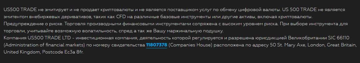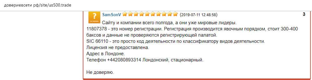 По словам автора следующего отзыва, компания-владелец US500 Trade LTD действительно зарегистрирована в Лондоне, только не в 2010 году, а в 2019 в феврале месяце. То есть аферисты своими датами вводят людей в заблуждение. Также есть момент с регуляцией деятельности - ее попросту нет существует у ДЦ ЮС 500 Трейд.