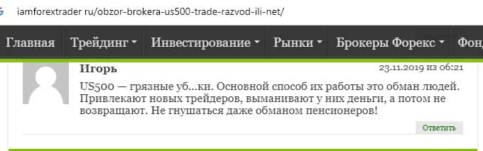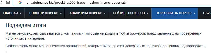 Следующий ресурс также не рекомендует связываться с форекс-компаниями, которые не входят в списки ТОП-брокеров, но и в этом утверждении есть много вопросов. Что же касается дилингового лохотрона ЮС 500 Трейд, то это организация, которая живет за счет доверчивых новичков, решивших подзаработать на финансовых рынках.