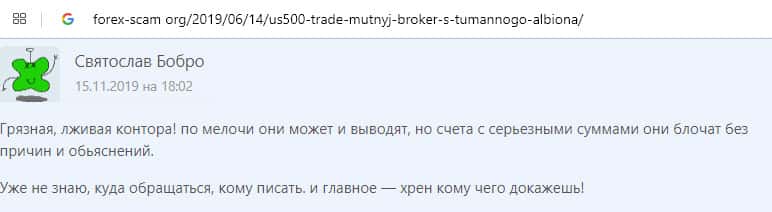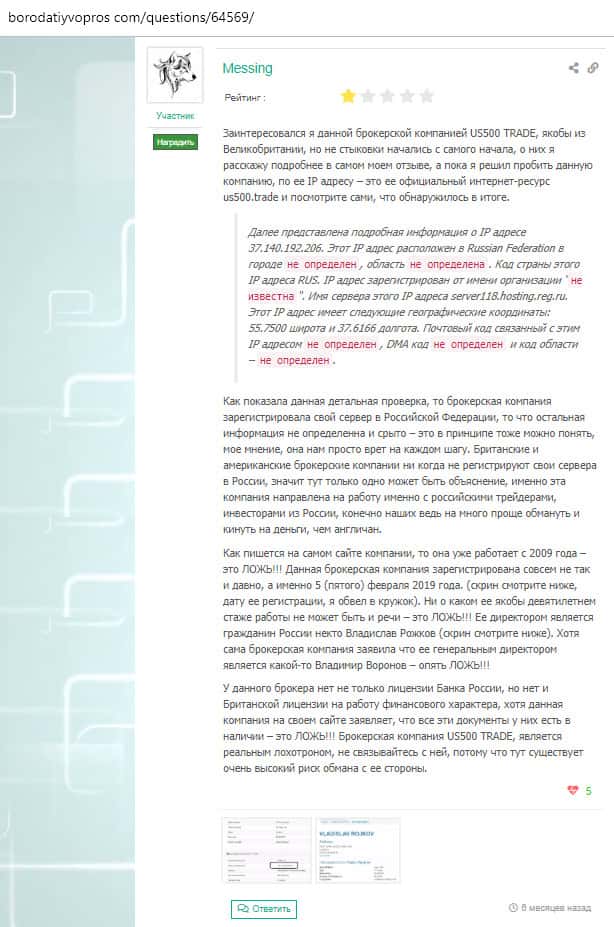 Далее представлен вывод из одной развернутой статьи о деятельности форекс-лохотрона US500 Trade. Аферисты славятся нечестным поведением по отношению к своим клиентам и соответственно это сказывается на их репутации. В интернете уже достаточно доказательств, что веб-контора ЮС 500 Трейд кидает людей.