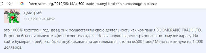 - Лохотрон US500 Trade связан с конторой Boomerang Trade