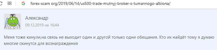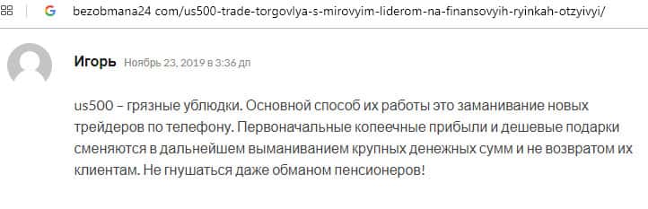 В следующем отзыве, человек рассказывает, что лохотрон US500 Trade является грязной конторой. Там работают мошенники-звонари, которые обзванивают базу клиентов и предлагают липовые брокерские услуги. Сначала начинают раскачивать новую жертву, давая даже немного вывести денег, а потом соответственно все сливают.