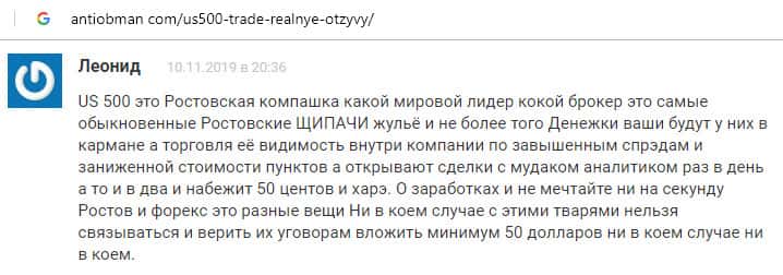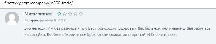 По словам автора еще одного отзыва, эта контора является гнусной и там работают не люди. Аферистам кухни US500 Trade все равно кто перед ними, будь-то инвалид, пенсионер, женщина детьми и прочее. Тем самым жулье освобождает свою совесть и действуют исключительно в рамках своего обогащения.