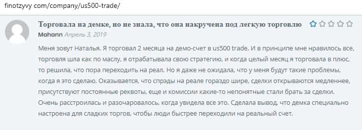 Одна клиентка рассказала, как она начала торговать в конторе US500 Trade, только используя дэмо-счет. Аналитики уверяли, что если она научится там торговать, то сможет зарабатывать деньги на реальном счете. Аферисты использовали ее доверие и когда она вложила деньги, то все было слито на раз.