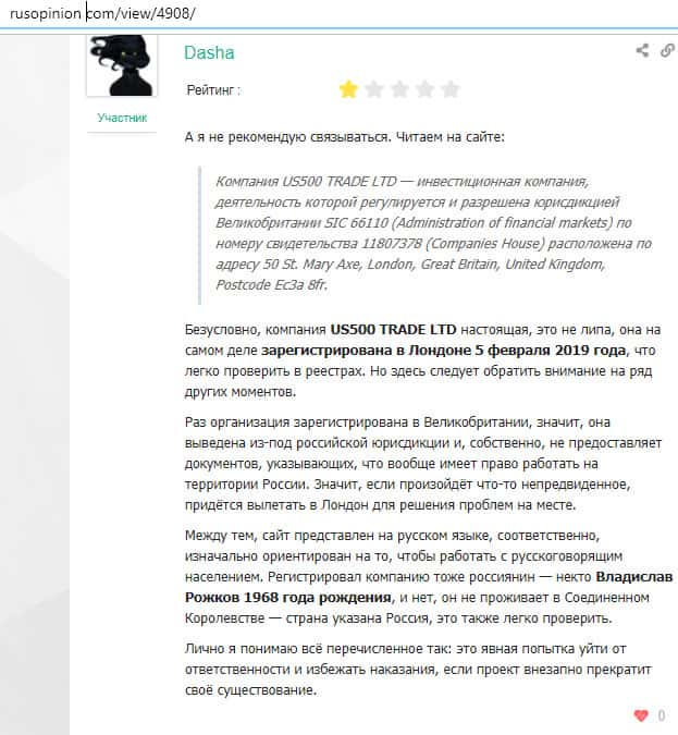 Целесообразность сотрудничества с ДЦ US500 Trade не подтверждена