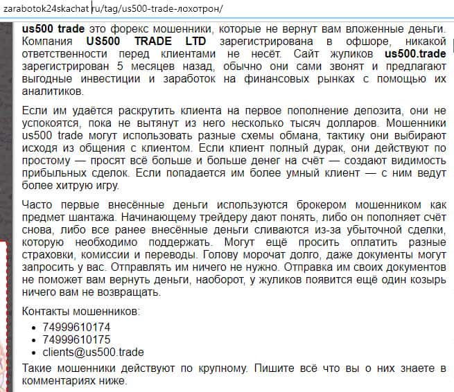 В следующей статье, в подробностях расписываются все нюансы, согласно которым, с конторой US500 Trade не следует связываться. По их мнению компания US500 Trade - стопроцентный лохотрон, который притворяется брокерской организацией, а по факту просто разводит клиентов на деньги.