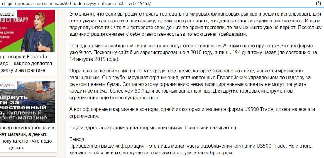- Подробная статья-отзыв о мошенниках US500 Trade