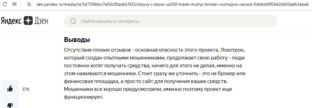 Еще один ресурс высказался не в пользу финансовой шараги US500 Trade. По их мнению это очередная ловушка для наивной клиентуры. Все что написано у них на сайте не соответствует действительности и это проверило уже множество клиентов. Да, поначалу дают немного зарабатывать и даже частично выводить, но потом вы теряете еще больше навсегда.