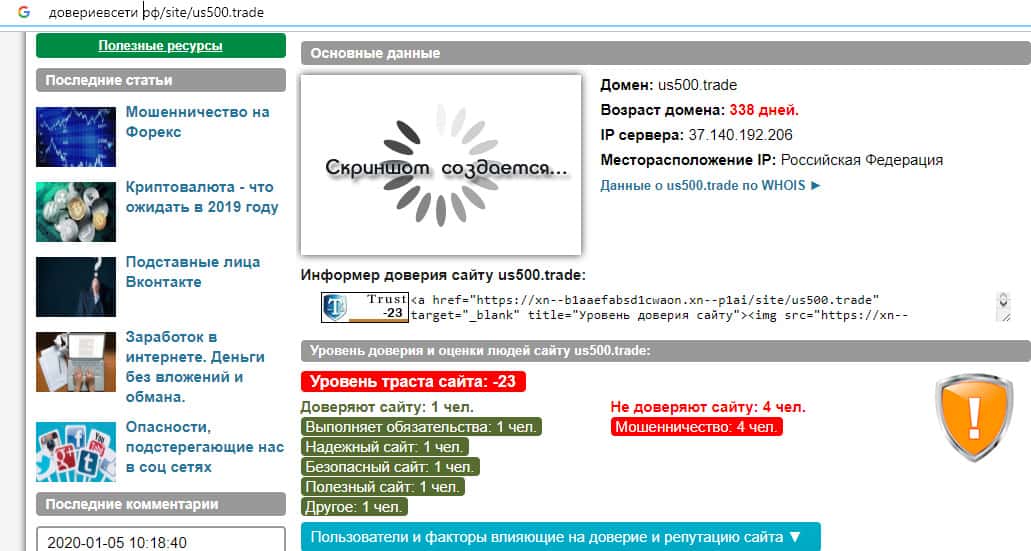 Согласно информации, которая размещена на ресурсе довериевсети рф, контора US500 Trade обманывает наивную клиентуру, при чем в наглую. Сайту жуликов нет еще даже года, а местонахождение сервера находится в Российской Федерации. Так что с Великобританией и основанием в 2010 году это никак не клеится.