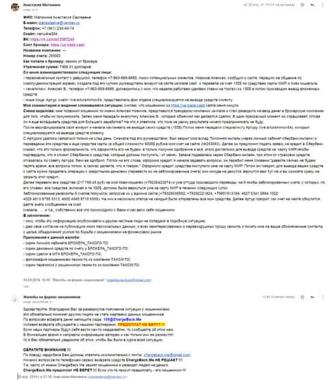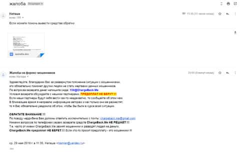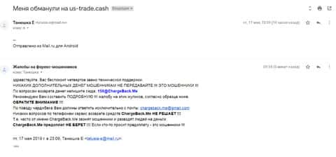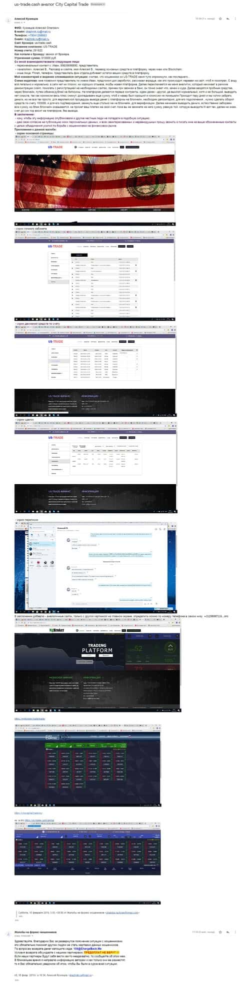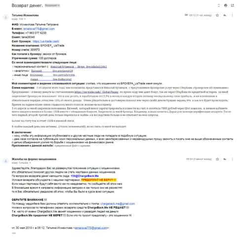 Далее представлено письмо, в котором жертва аферистов брокерской кухни ЮС Трейд прикрепил развернутую жалобу со всеми подробностями совершенного преступления.
