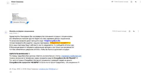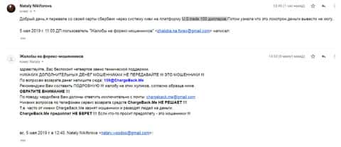 Следующую подробную жалобу на кухню ЮС Трейд прислала одна женщина, которая просит помощи у компании по возврату средств из форекс-лохотронов ChargeBack.Me так как ее опрокинули на сумму в 100 долларов. Цифра довольно небольшая, но это тоже деньги и не хотелось бы, чтобы аферисты нажились на этом.