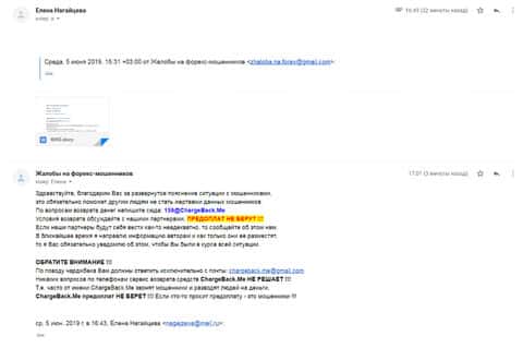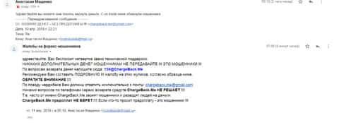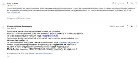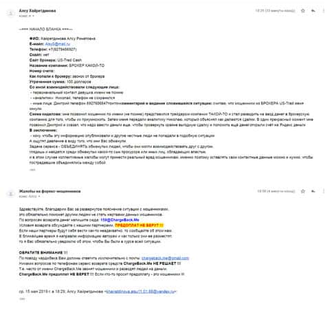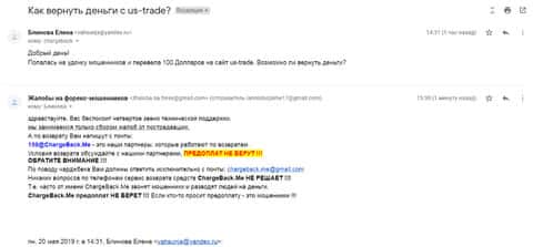 Еще одна женщина рассказала нам историю в которой попалась на форекс-аферистов ЮС Трейд. Мошенники раскатали ее на внесение депозита в размере 100 долларов. Но как только она заикнулась о выводе, сразу же стали вымогать дополнительные платежи. По совету подруги она обратилась в компанию ChargeBack.Me за помощью.