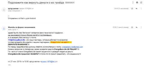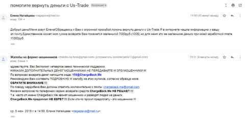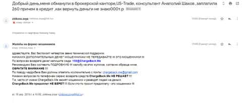 Далее представлен скриншот первоначального письма, который прислал клиент кинутый лохотроном US-Trade.