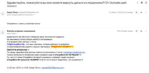 Еще одну клиентку наглые мошенники ЮС Трейд прокидали на 117 долларов, что для русскоязычных стран и так является приличной суммой. Аферистам US-trade до клиентов нет никакого дела, им лишь бы поживится. Клиентка была направлена на доверенный веб-сайт ChargeBack.Me для возврата потерянных в ЮС Трейд средств. Контакты мошенников: