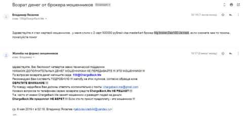Автор данного письма попался сразу к нескольким форекс-мошенникам и потерял там порядка полмиллиона рублей, при чем шулера отказываются что-либо возвращать. Теперь компания ChargeBack.Me постарается помочь вывести деньги с таких жульнических контор: МГ Брокер, ДАХ100, ЮС-Трейд.