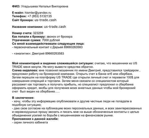 - Детальная жалоба на US Trade от клиента, потерявшего 100$