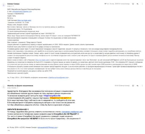 Вся схема лохотрона проходила в обычном режиме. Сначала звонарь уговорил вложить небольшую сумму в контору ЮС Трейд, потом стали раскачивать депозит и вытягивать все больше и больше денег. Ну а следующим этапом был слив всех вложений и полное игнорирование. Теперь, чтобы жулье зашевелилось и отдало деньги, она написала в ChargeBack.Me где пообещали помочь.