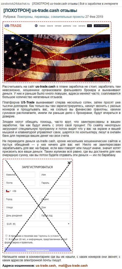Помимо отзывов клиентов, о лохотроне US-Trade Cash также присутствует приличное количество обзоров и объективных статей, раскрывающих всю суть мошенников. Одной из таких является статья, написанная админом выше упомянутого сайта zarabotok24skachat. Автор подчёркивает то, что мошенники ЮС Трейд могут вам обещать что угодно, любые золотые горы, лишь бы вы кинули им денег. Как только те самые деньги вы им давать перестанете. Ваш счёт магический образом "обнулится".