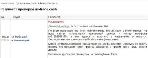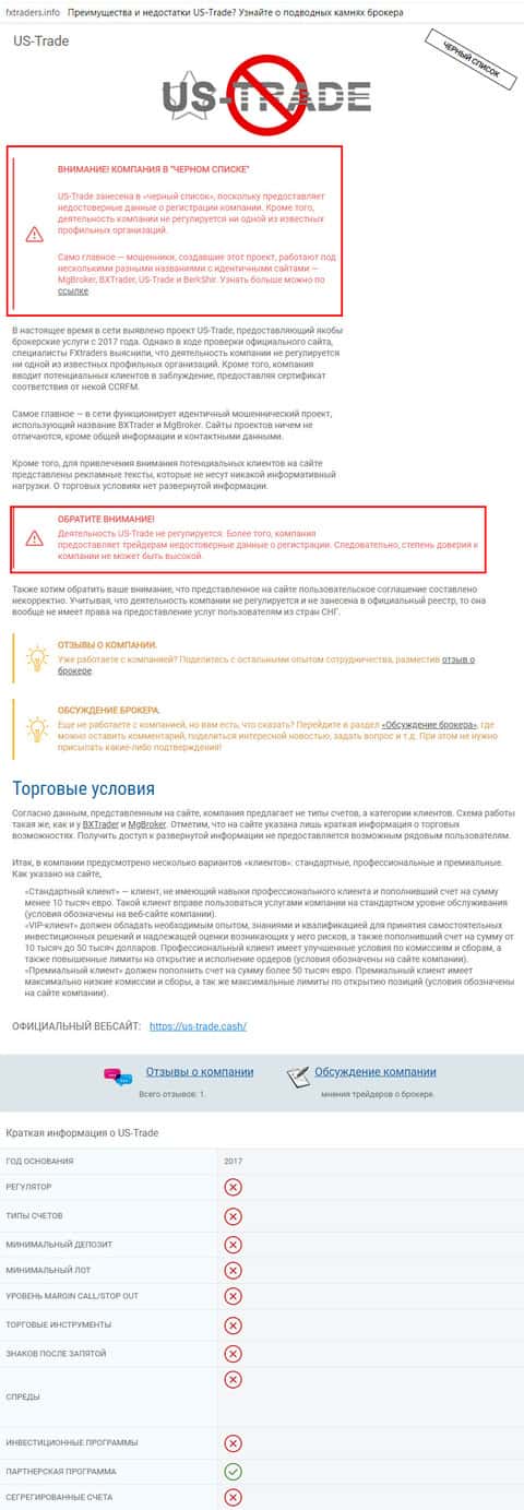 ЮС Трейд присутствует в чёрном списке еще одного сайта, fxtraders info. С него также был взят один из отзывов, приведённых выше. В статье на этом сайте раскрывается полное несоответствие конторы US-Trade Cash действительности. Все фактические данные указанные на сайте ЮС Трейд с огромной вероятностью – липа, что и является главным признаком мошеннических контор, а именно, несоответствие заявленной на сайте информации действительности.