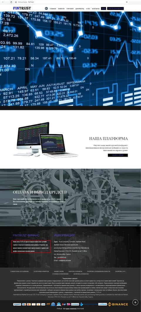 Выше представлен, собственно сайт ЮС Трейд. Ниже будет приведёт его собрат, некий FinTrust, о котором есть статья и на нашем сайте. Обе эти конторы идентичны, вплоть до дизайна, мобильного номера, данного в разделе контактов, и самого текстового наполнения сайтов. Различаются только адреса, наиболее вероятно, фейковые. Это подтверждает то, что US-Trade Cash – одна из десятков однотипных контор, имеющих одних хозяев и созданные для массированного развода людей русскоязычных стран.