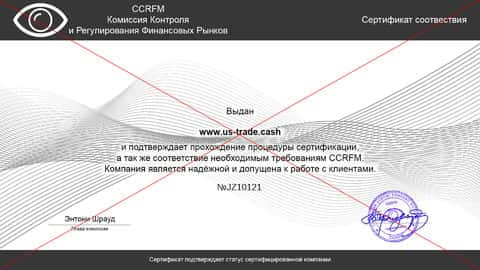 Лицензии на брокерскую деятельность у US-Trade Cash, ожидаемо, нет. Как и какого-либо документа от русскоговорящей инстанции по типу Центрального Банка, регулирующего деятельность финансовых рынков. Вместо этого у ЮС Трейд имеется, как вы видите выше, криво нарисованный сертификат от некой конторы под названием CCRFM.