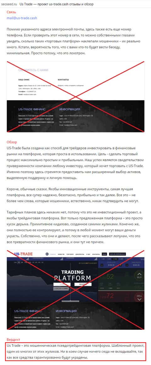 В числе прочих, опубликовавших материал о жуликах ЮС Трейд, также оказался еще один уважаемый веб-ресурс под названием seoseed ru. Особенно подчёркнуто было авторами сайта сеосид ру сходство мошеннической конторы US-Trade Cash подобным ей сайтам-однодневкам, созданным лишь для выманивания денег с честных людей.