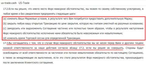 Вишенка на торте – форс-мажоры, или обстоятельства преодолимой силы, которые являются еще одним рычагом манипуляции хитрых аферистов US-Trade Cash. Как видите, жулики снимают с себя ответственность за все потери клиента при форс-мажоре, хотя чёткого определения форс-мажора нет, и мошенники могут выдать за него любое, подстроенное ими же событие, по типу: "Связь с сервером пропала, все ваши деньги слиты, но мы за это не в ответе, это был форс-мажор". Стандартная мошенническая ахинея.