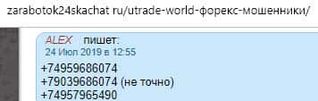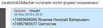 На одном из ресурсов нам удалось найти некоторые данные жуликов UTrade World, а именно номера телефонов, имена и фамилии. Жулье обычно использует разные номера, а также имеют привычку менять свои псевдонимы, так что будьте осторожны. Далее предоставим контактные данные шулеров: