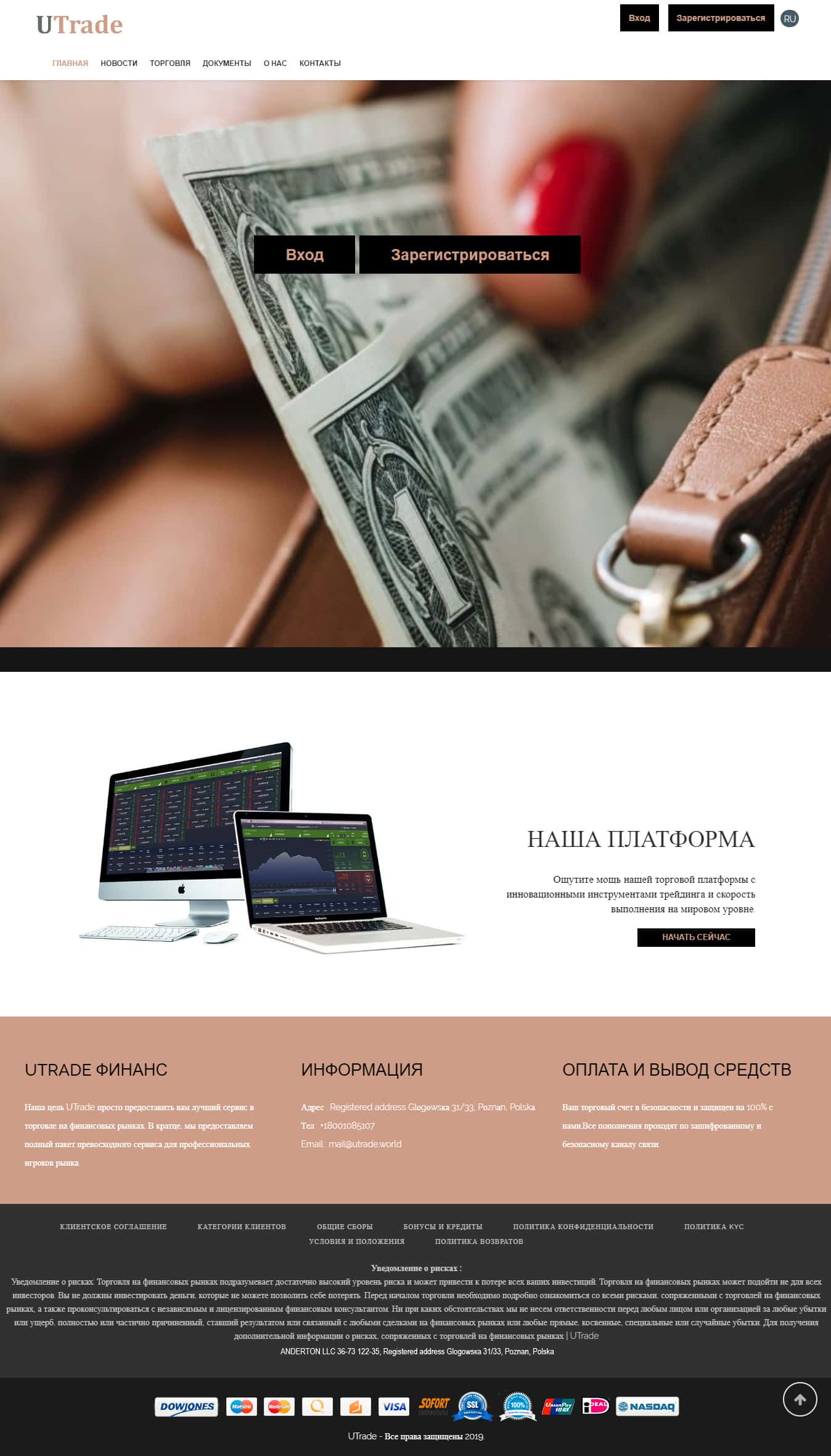 Что касается руководства аферистов ЮТрейд, нет никакого упоминания даже такого слова, так как мошенники привыкли скрываться от публичности, дабы не быть привлеченным к ответственности за свои поступки. Можем только опубликовать, что на самом деле эта UTrade World зарегистрирована в Польше как Anderton LLC 36-73 122-35.
