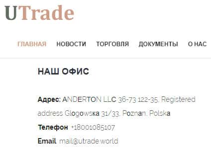 Контакты, по которым можно связаться с аферистами UTrade World размещены на их официальном сайте. Там указан как адрес конторы, так и телефон и электронная почта. Таким образом шулера пытаются втиснуться в доверие к своим будущим жертвам, а по итогу просто кинут на деньги и заблокируют номера. И все же вот их данные: