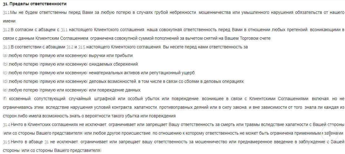 Договор конторщиков ЮТрейд просто наполнен дырами, через которые мошенники начнут увиливать от ответственности при первой же возможности. Например есть такой раздел, как Пределы ответственности, где лохотрон снимает с себя полную ответственность за убытки, которые понесет клиент при сотрудничестве с ними.