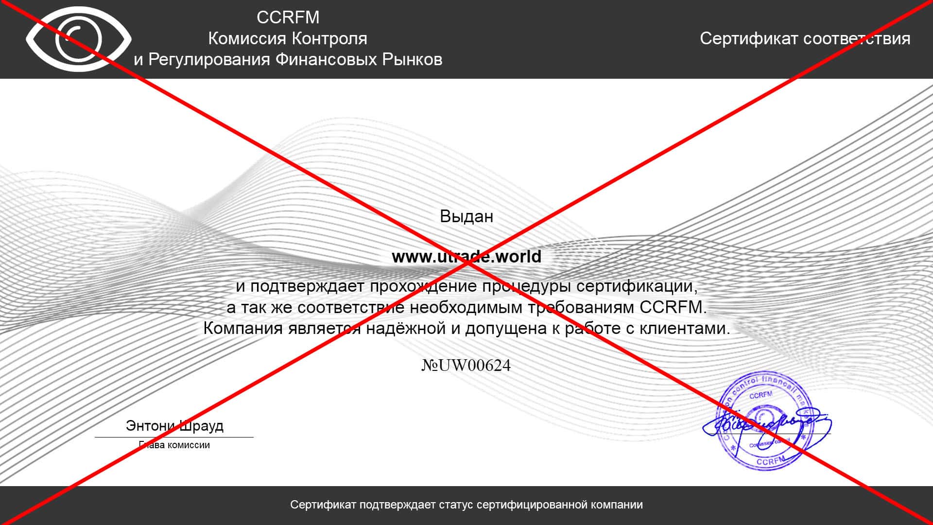 По поводу лицензии, жулики UTrade World предоставили один документ, который является липовым на 100%. Во-первых на самом деле CCRFM не существует ни в каком реестре как международная организация, а именно Комиссия Контроля и Регулирования Финансовых Рынков. А во-вторых, ниже представленный сертификат является фейковым.