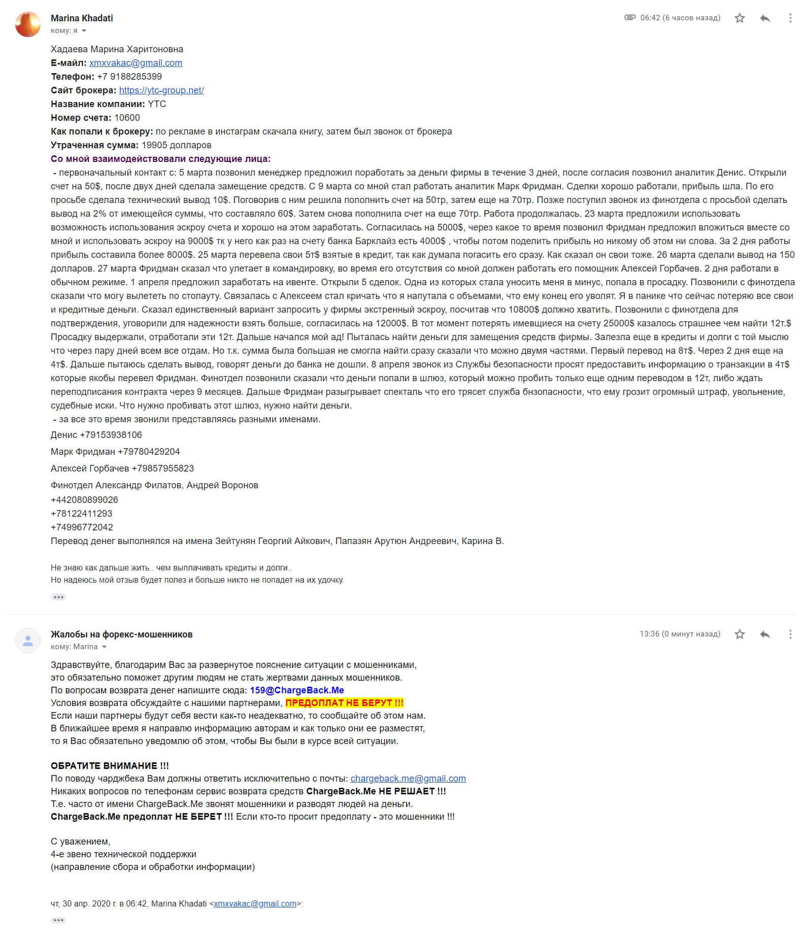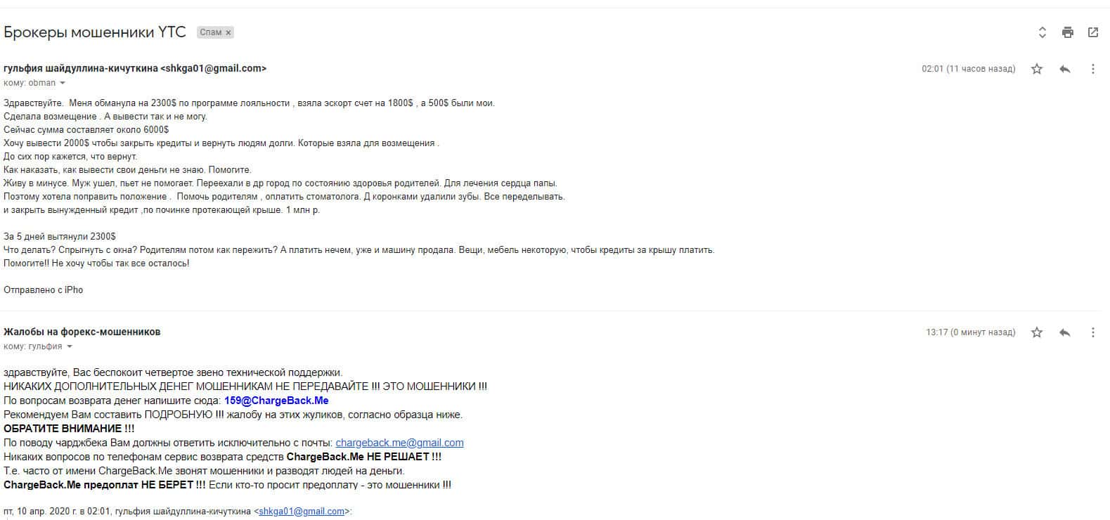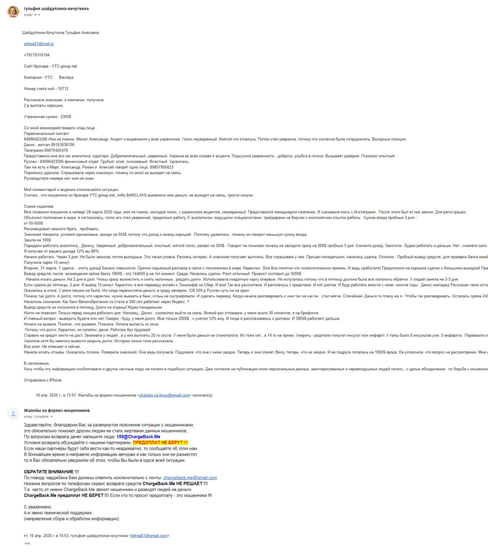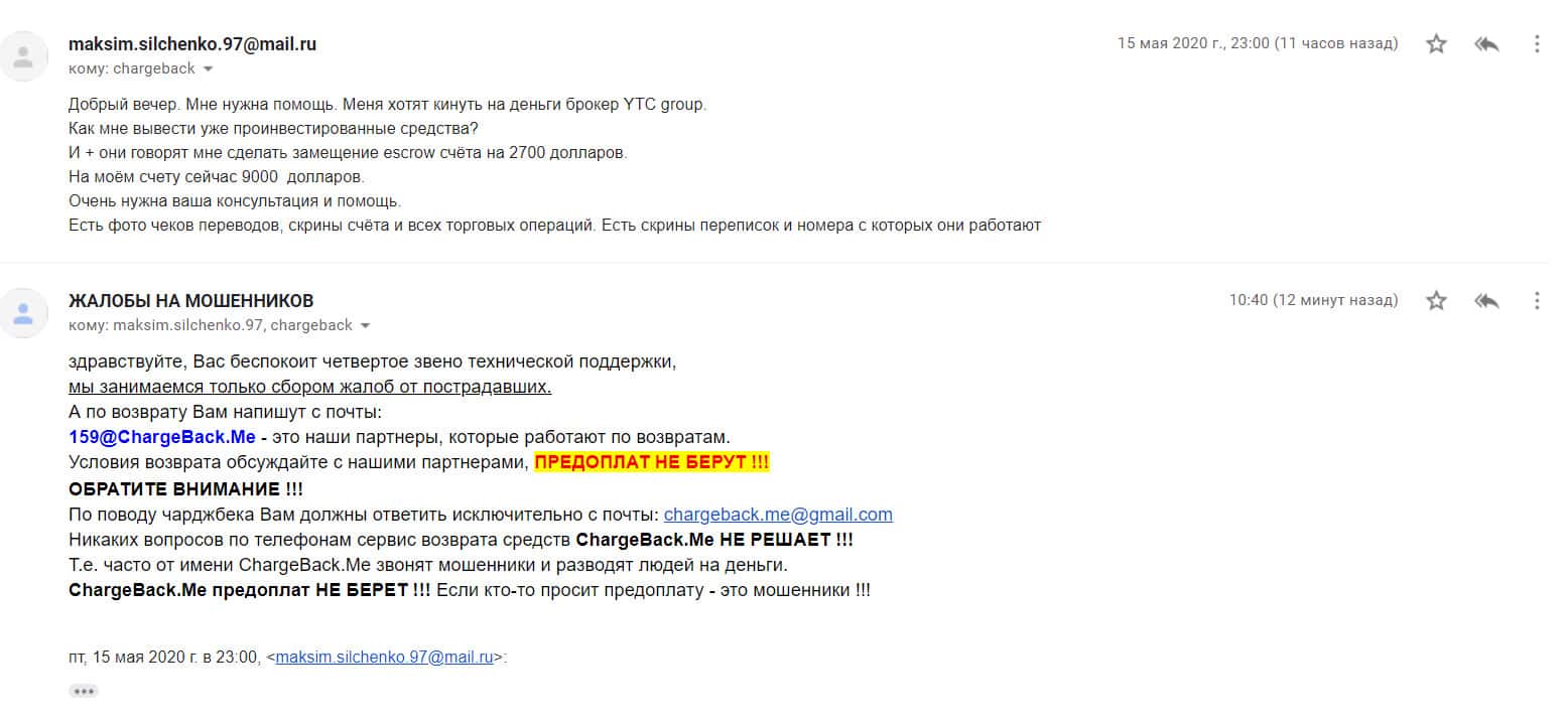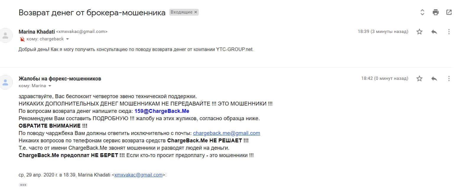 Спустя некоторое время на почтовый адрес интернет-сервиса, разоблачающего мошенников во всемирной паутине, поступила подробная жалоба от обманутой клиентки YTC-Group.