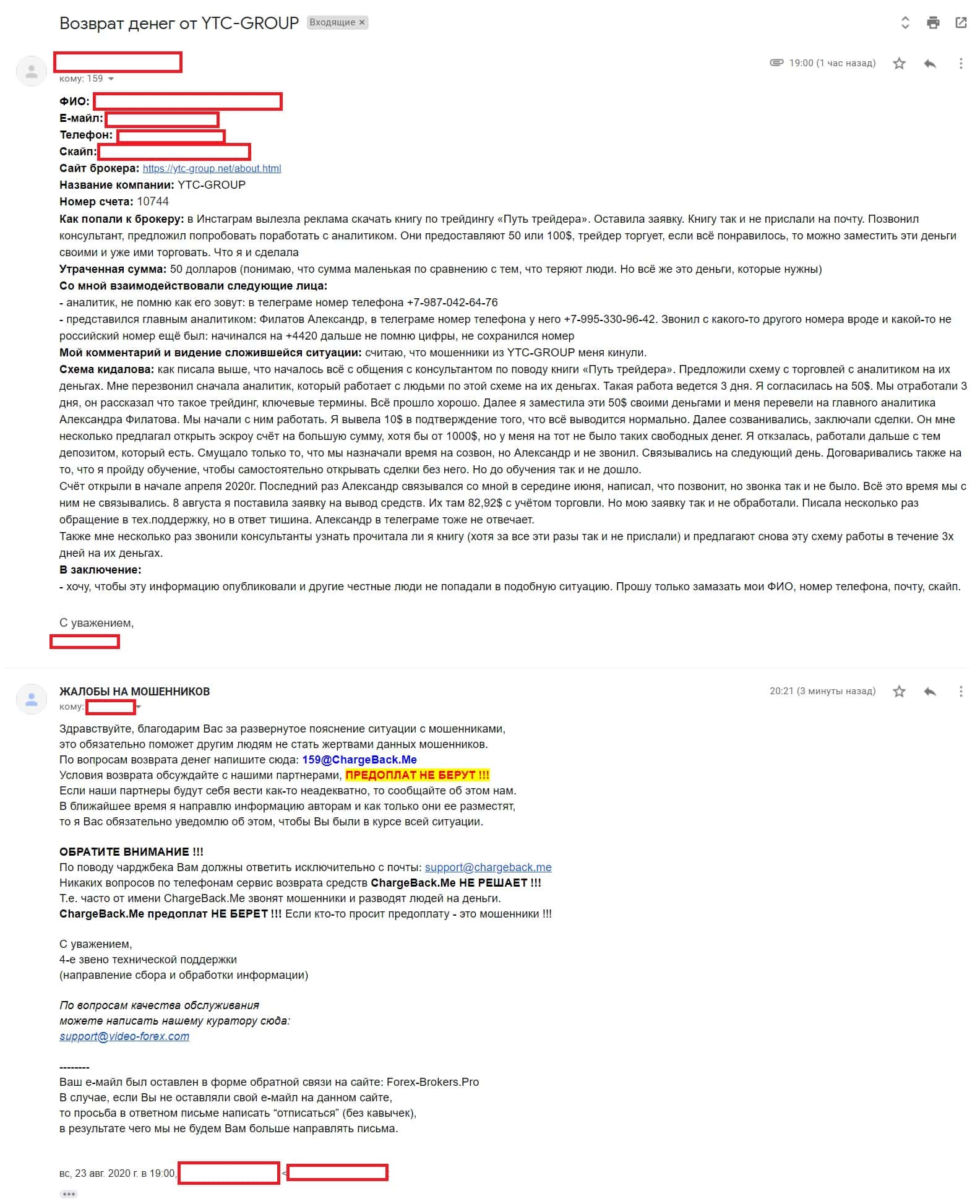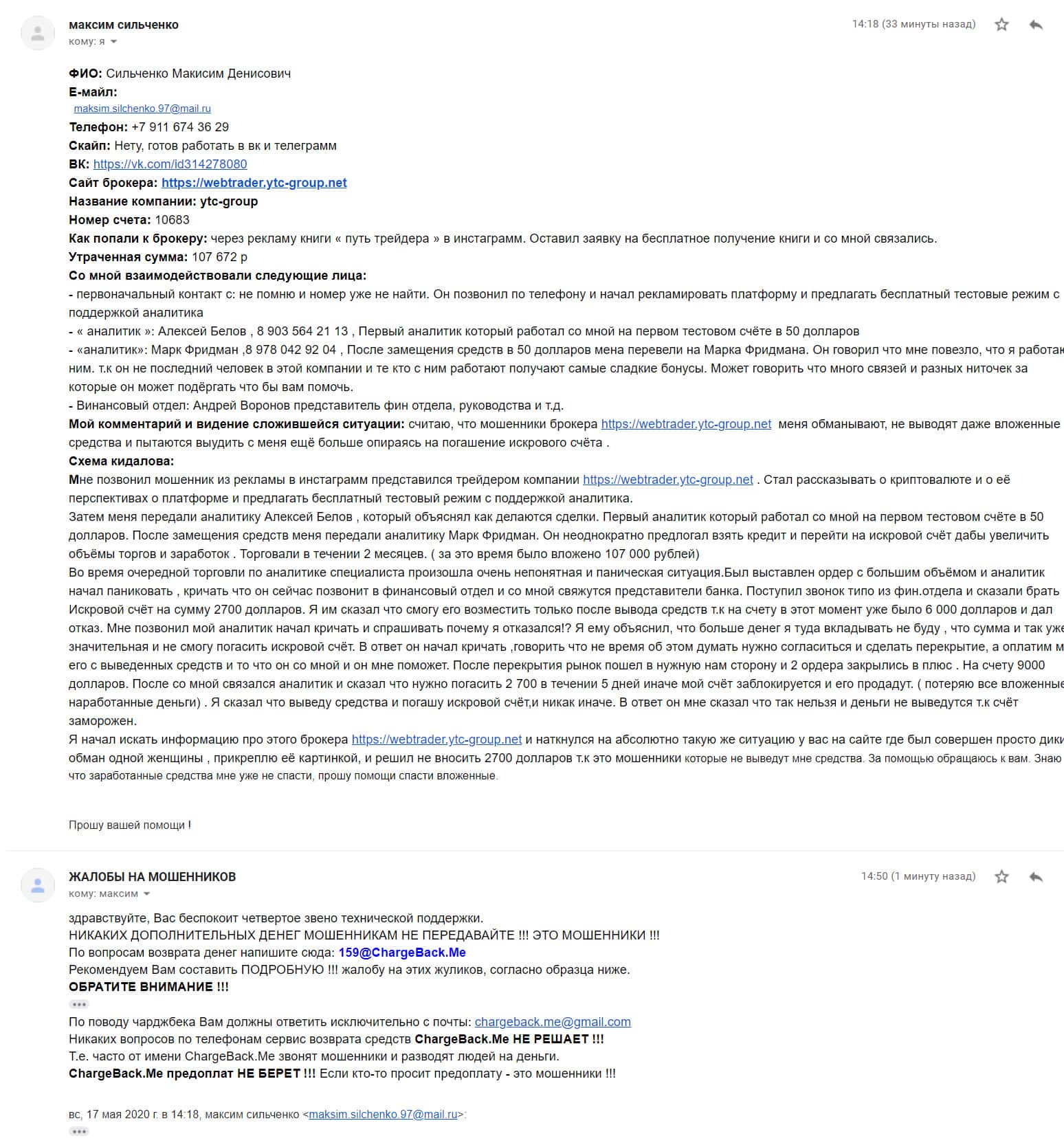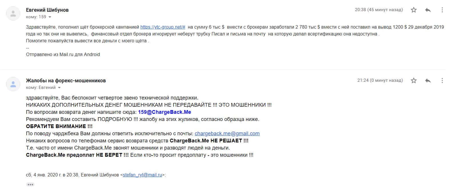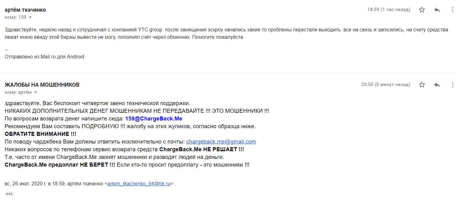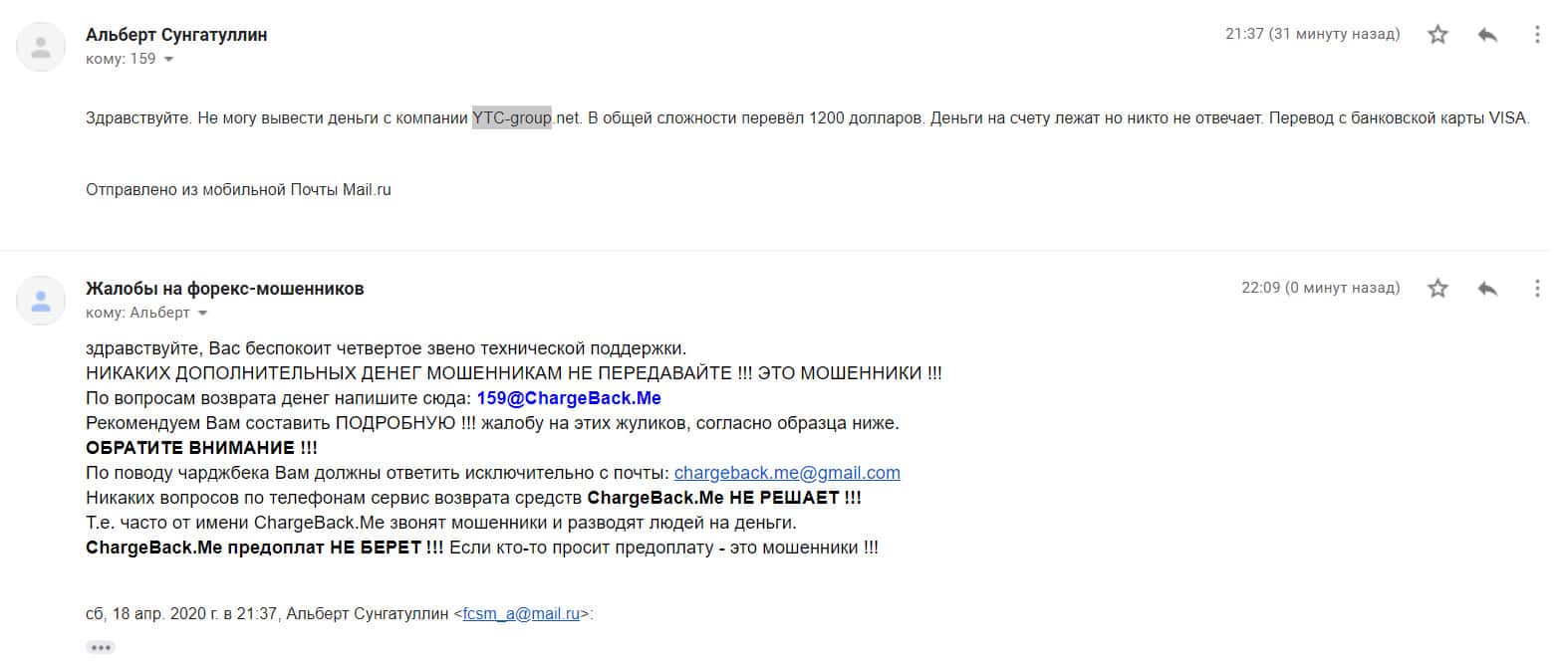 Спустя некоторое время на почтовый адрес интернет-сервиса, разоблачающего мошенников во всемирной паутине, поступила подробная жалоба от обманутой клиентки YTC-Group.