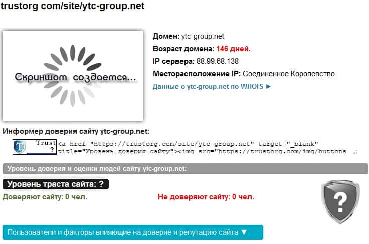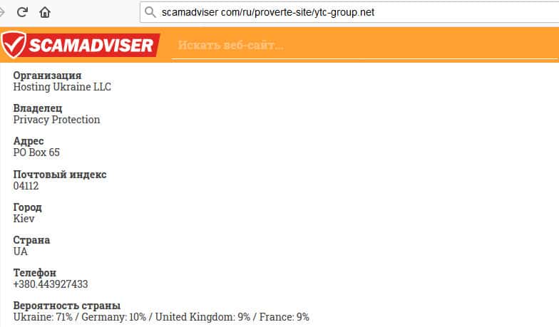 Если проанализировать информацию с сайта scamadviser com/ru, то сразу становится понятно, что свои корни жулики YTC-GROUP Net берут из Украины. При всем уважении к украинцам, но данная юрисдикция не относится к числу безопасных и авторитетных, поэтому сайт сразу подсветил ее как сомнительную.