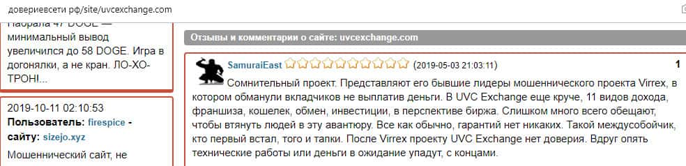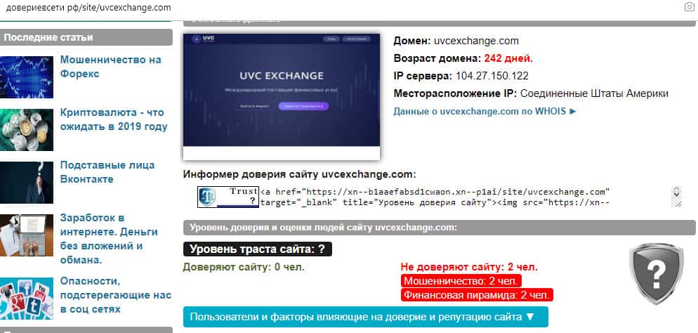 По информации, которую выдал о сайте конторы UVC Exchange ресурс довериевсети рф, возраст домена составляет около 242 дней на момент создания этой статьи. Также не доверяют сайту 2 человека, которые считают, что это мошенничество созданное на принципах финансовой пирамиды.