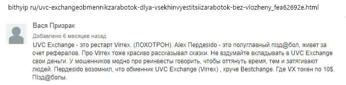 По мнению очередного интернет-пользователя, лохотрон UVC Exchange представляют бывшие лидеры мошеннического хайпа Virrex, который опрокинул в свое время не одну сотню людей. Жулье слишком много чего обещают, а тем самым ничего не исполняют. Поэтому, чтобы не попасться в лапы мошенников ЮВС Эксчендж, лучше всего обходить из стороной.