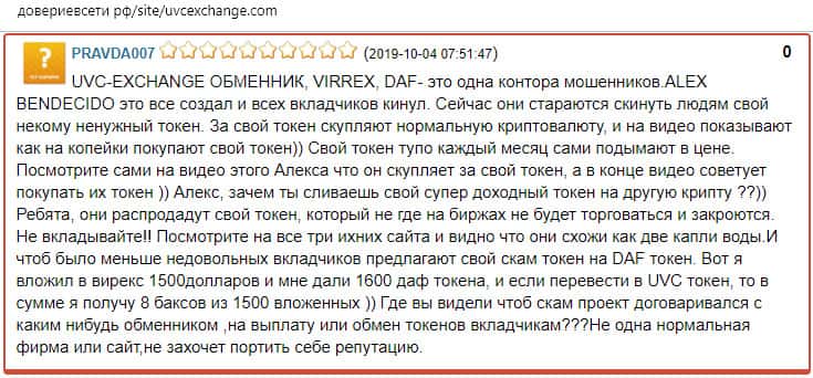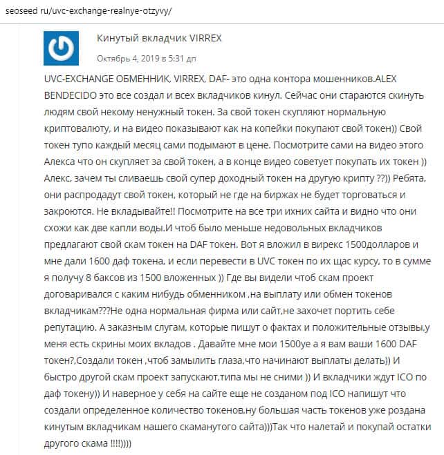 В данном отзыве человек провел целое расследование, так как сам попался на уловки аферы UVC Exchange. В отзыве сказано, что данная компания ведет смежную деятельность с конторами Virrex и DAF. Всем этим заправляет некий Alex Benedicto, которые занимается и завлекаловом через Ютуб и потом выманивает деньги из карманов клиентов.