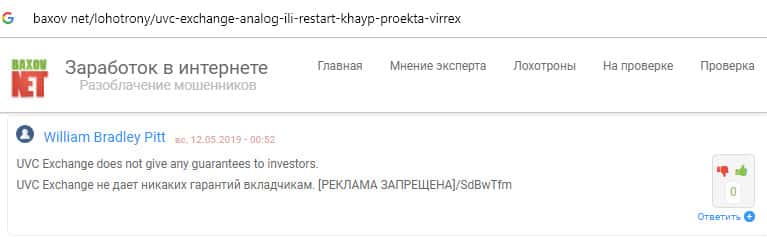- Очередной портал не одобрил инвестирования в хайп UVC Exchange