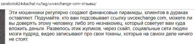 Еще один ресурс, который проводил исследование и анализ деятельности интернет-лохотрона ЮВС Эксчендж, заверяет, что доверять обещаниям заработка в этой компании не стоит. Потому что есть множество факторов, которые неуместны для нормальной организации. Так что сотрудничать с жульем UVC Exchange не рекомендуется.