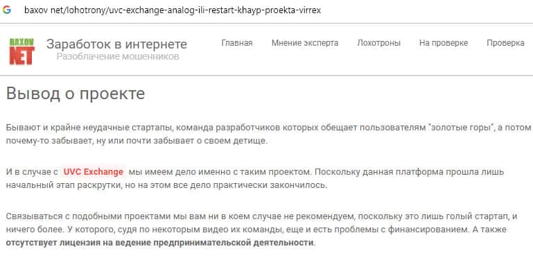 Вывод о лох-проекте UVC Exchange от авторитетного ресурса