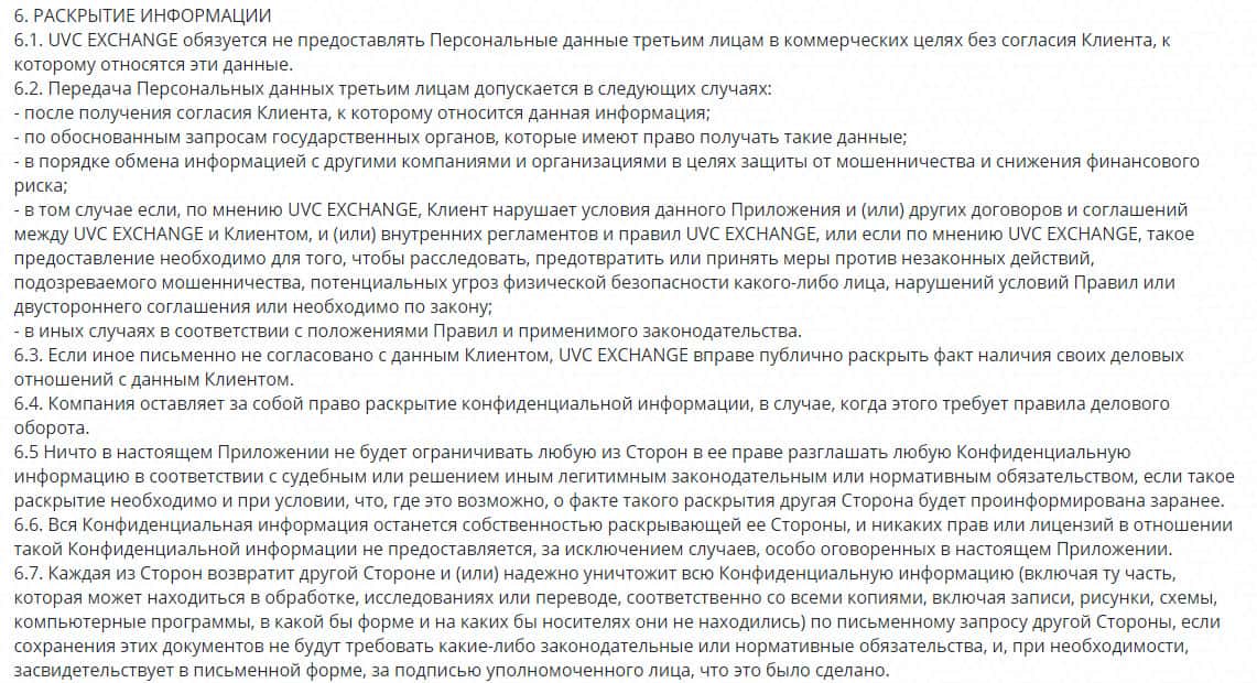 Политика конфиденциальности у хайпа UVC Exchange также наполнена какими-то двойными стандартами. Сначала они пишут, что они обязуются не предоставлять персональные данные клиентов третьим лицам, а следующим пунктом эти все слова опровергают и ссылаются на ряд исключений, при наступлении которых лохотрон ЮВС Эксчендж нести ответственность не будет.