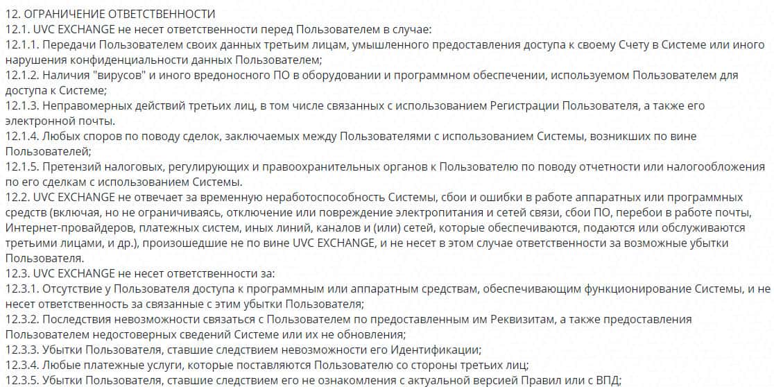 Если внимательно прочитать клиентское соглашение аферистов UVC Exchange, то можно отметить один очень интересный раздел, в котором сказано, что данная контора не несет никакой ответственности перед своим клиентом, как за убытки, которые он может понести при сотрудничестве с ними, так и утерю личных данных.