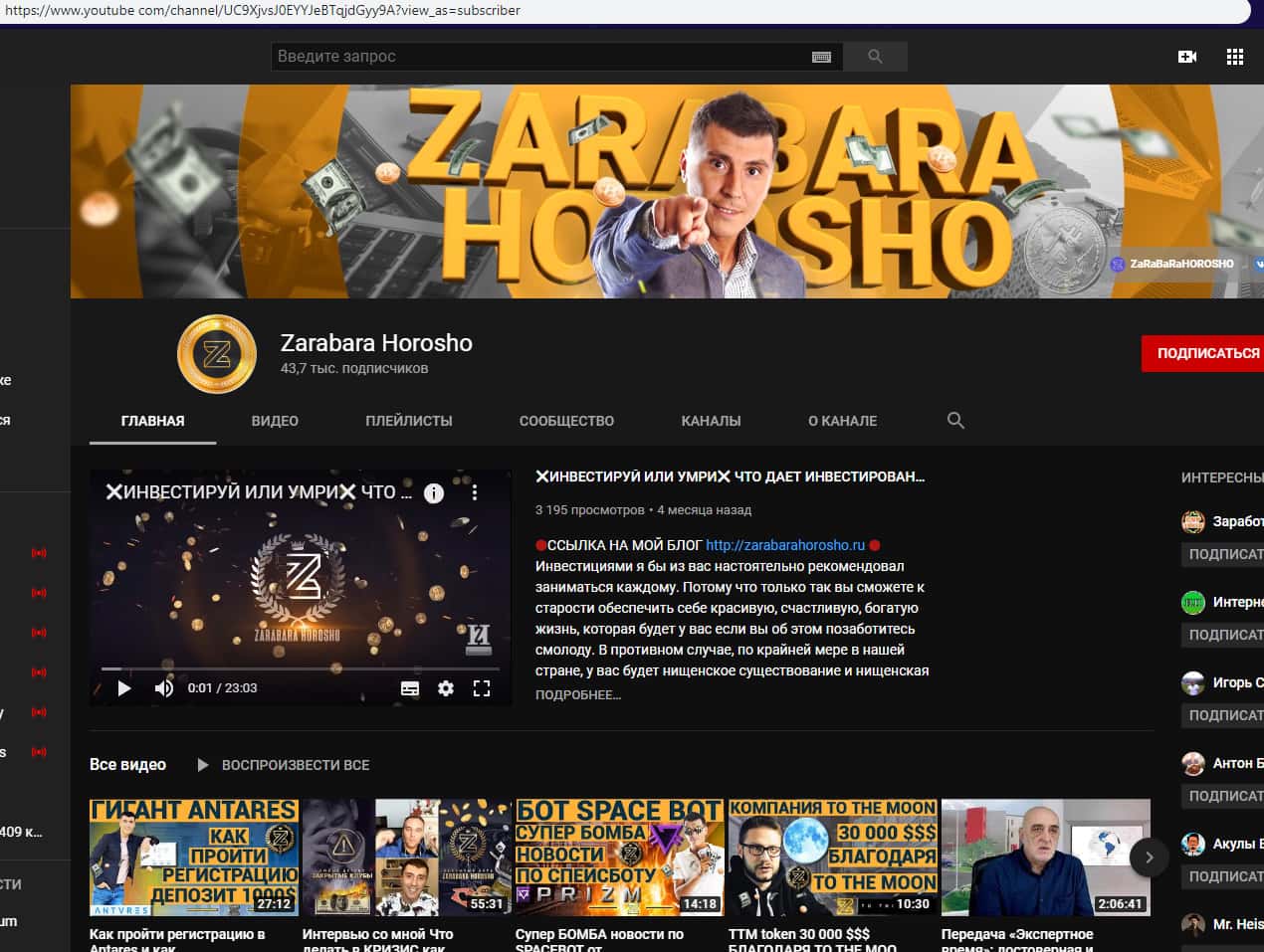Для размещения различных мотивационных видеороликов с лапшой на уши наивной клиентуре аферисты ZarabaraHorosho Ru обзавелись страницей в социальной сети YouTube, где у мошенников Зарабара Хорошо имеется несколько десятков тысяч подписчиков. На изображении, расположенном ниже, вы можете увидеть страницу аферистов на Ютубе.