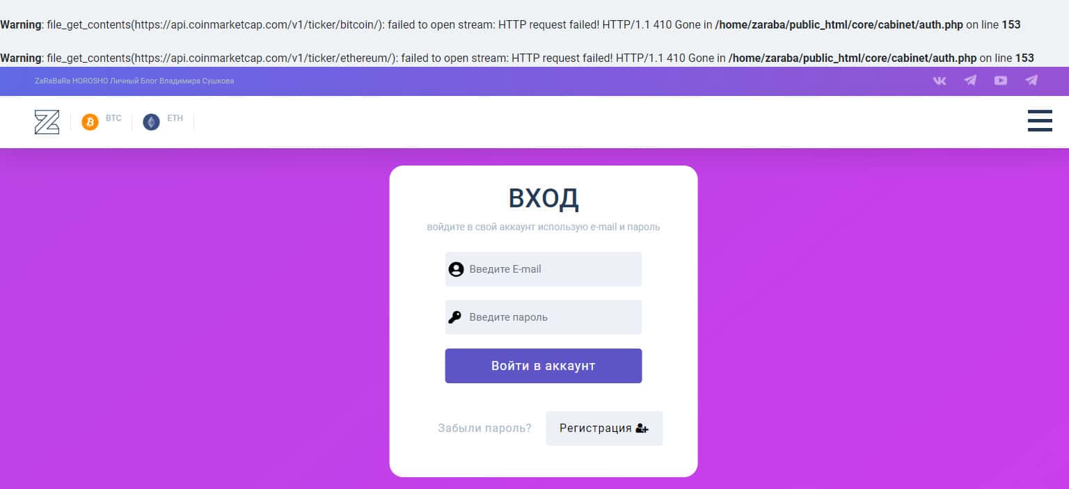 Еще лучше убедиться в халтуре аферистов ZarabaraHorosho Ru можно на странице входа, где у мошенников Зарабара Хорошо открыто отображаются ошибки их кривого сайта, что еще раз говорит об определенной халтуре проходимцев ZarabaraHorosho Ru. На изображении, расположенном ниже, вы можете наглядно увидеть данный раздел сайта шулеров.